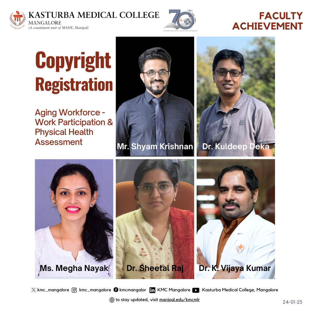 Congratulations to the Department of Physiotherapy, KMC Mangalore, for securing copyright registration for their literary work titled "Aging Workforce: Work Participation & Physical Health Assessment".