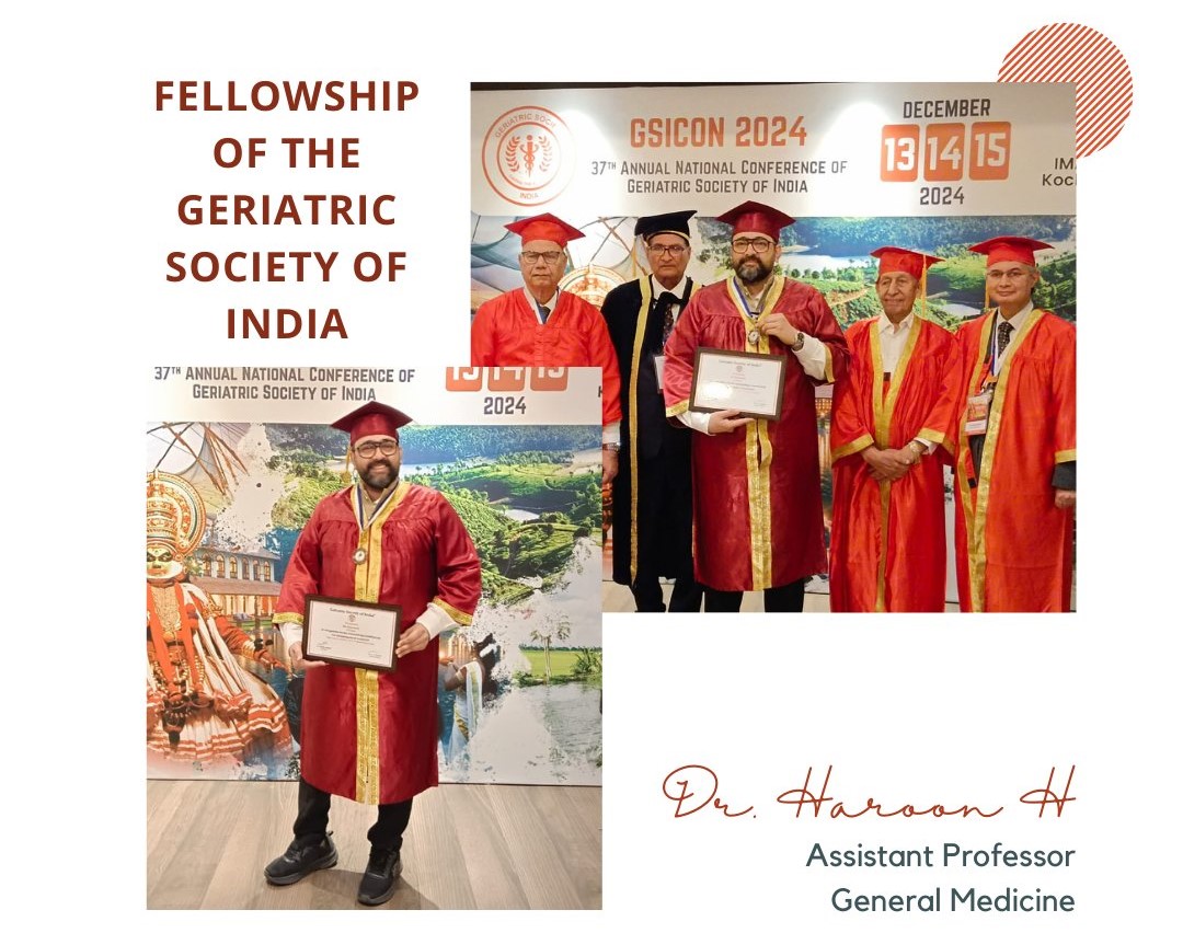 Congratulations to Dr. Haroon H, Assistant Professor, Department of General Medicine, KMC Mangalore, for being awarded the Fellowship of the Geriatric Society of India at the 37th Annual National Conference in Kochi.