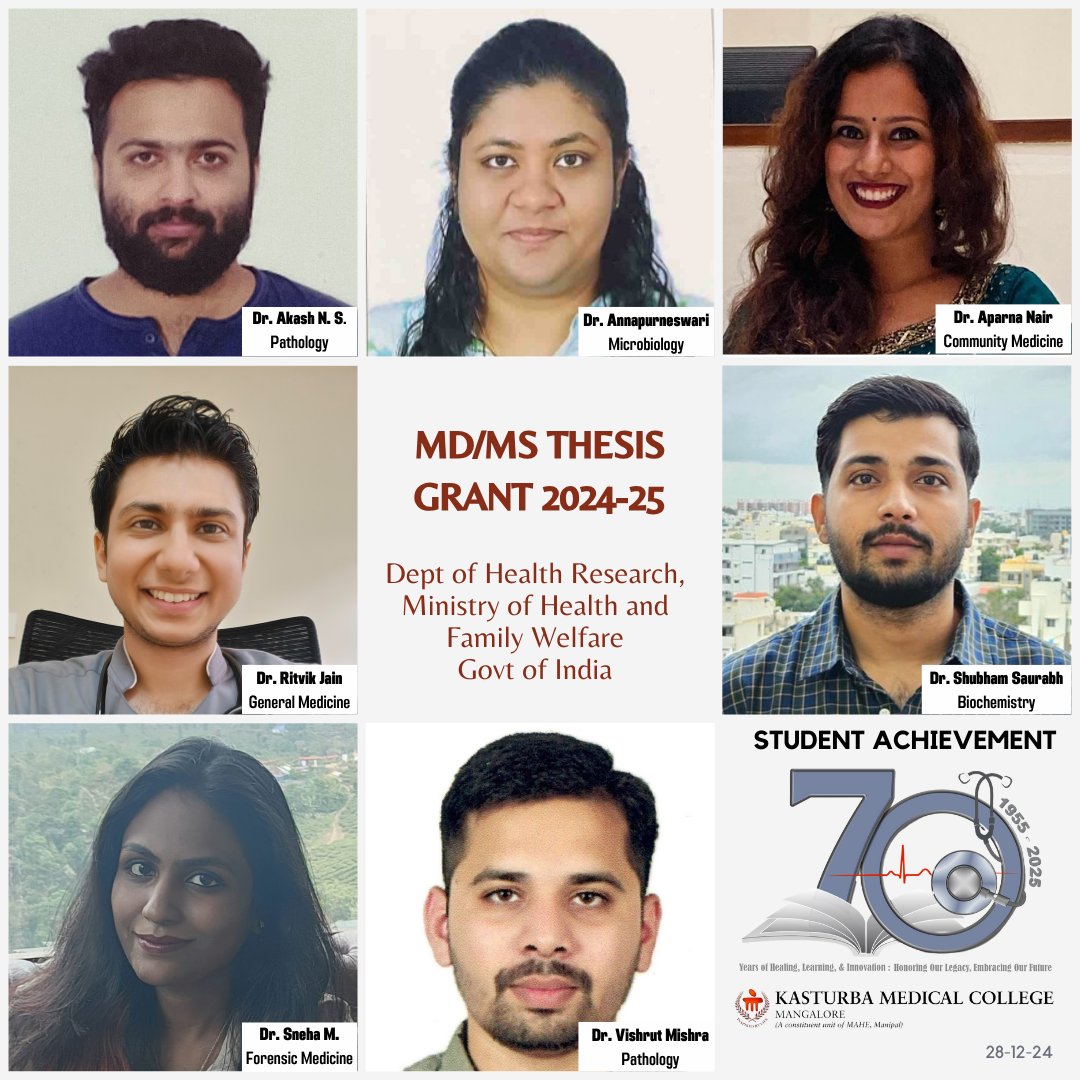 We are delighted to share that seven of our postgraduate students have been awarded financial support grants for their MD/MS thesis 2024 under the Human Resource Development Scheme of the Department of Health Research (DHR), Ministry of Health and Family Welfare, Government of India for the FY 2024-25.
