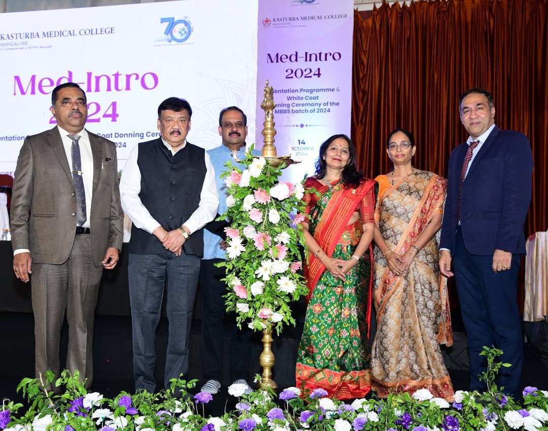 The Med-Intro 2024 event was held on October 14 at the Dr. T M A Pai International Convention Center, Mangalore, for the MBBS batch of 2024. The ceremony began with an invocation, lighting the lamp, and floral tributes to the founder, followed by a warm welcome and college overview by Dean Dr. B. Unnikrishnan.