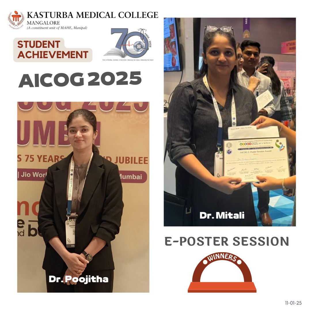Congratulations to our MS 2022 Batch postgraduates in the Department of Obstetrics & Gynaecology, Dr. Mitali Singh and Dr. Poojitha S., for securing 1st place in the e-poster presentations at the All India Congress of Obstetrics and Gynaecology (AICOG) 2025 National Conference in Mumbai!