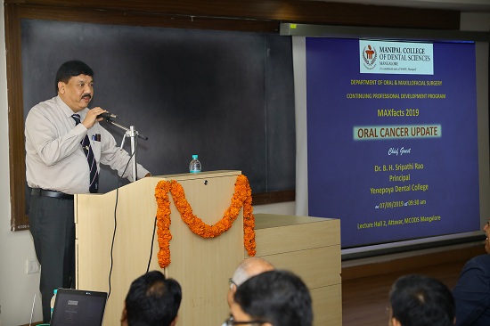 The Department of Oral and Maxillofacial surgery conducted Continuing Professional Development Program MAX facts 2019 titled “Oral Cancer Update” on the 7th of September, 2019. It was indeed a proud moment and great privilege for us to host the August gathering. The Chief Guest at the inauguration was Dr. B. H. Sripathy Rao, Principal of Yenepoya Dental College and a Teacher of Teachers. The Dean, Dr Dilip G. Naik welcomed the gathering and led the Felicitation of Honoured Chief Guest for his dedicated service to the field of Dentistry and Oral & Maxillofacial Surgery. Associate Dean, Dr. Premalatha Shetty, Professor Dr. Mohan Baliga, Dr. Arvind R, Incharge Head Oral & Maxillofacial Surgery, colleagues, faculty and students wished and thanked the Chief Guest. The accomplished guest speakers of the day were Dr. Vishal Rao and Dr. Deepak Balasubramanian. Dr. Vishal Rao U.S. is the Chief of Head & Neck Surgical Oncology & Robotic surgery at HCG Cancer Centre, Bengaluru. His area of expertise is head & neck surgery. Dr. Vishal Rao is the inventor of ‘AUM Voice Prosthesis’, a $1 speaking device for throat cancer patients. Dr. Vishal Rao enlightened the audience on Etiology, Immunology, Molecular biology, Recent trends in Management, Heterogeneity of oral cavity subsites, Potentially malignant disorders. The inspiring talk provided new information and ideas shaping the very forefront of cancer research. Dr. Deepak Balasubramanian is Clinical Associate Professor in the Department of Head & Neck Surgery at Amrita Vishwa Vidyapeetham, Kochi. He has trained extensively in Head & Neck Oncology and Reconstructive microsurgery and presented talk on Surgical considerations in Oral Cancer and role of neck dissection and was well appreciated by the audience. More than 70 delegates attended the program and actively participated in the deliberations and provided their feedback.