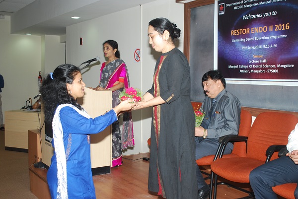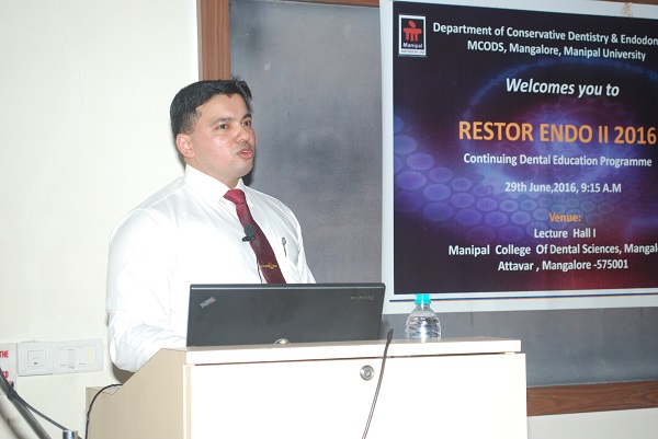 Department of Conservative Dentistry and Endodontics, Manipal College of Dental Sciences, Mangalore successfully conducted a CDE programme RESTOR ENDO II on 29th june, 2016 at Attavar premises. The Continuing Dental Education Programme was basically held to motivate the young researchers to help in their research work and carry out publications. Head of the Department, Dr. Neeta Shetty welcomed the gathering that included the Chief Guest, Dr. Dilip Nayak, Dean of MCODS, Mangalore, and eminent speakers, Dr. Nidambur Vasudev Ballal, Dr. Ramya Shenoy Kudpi and Dr. Suchitra Shenoy M, dignitaries, invitees, faculty members and students