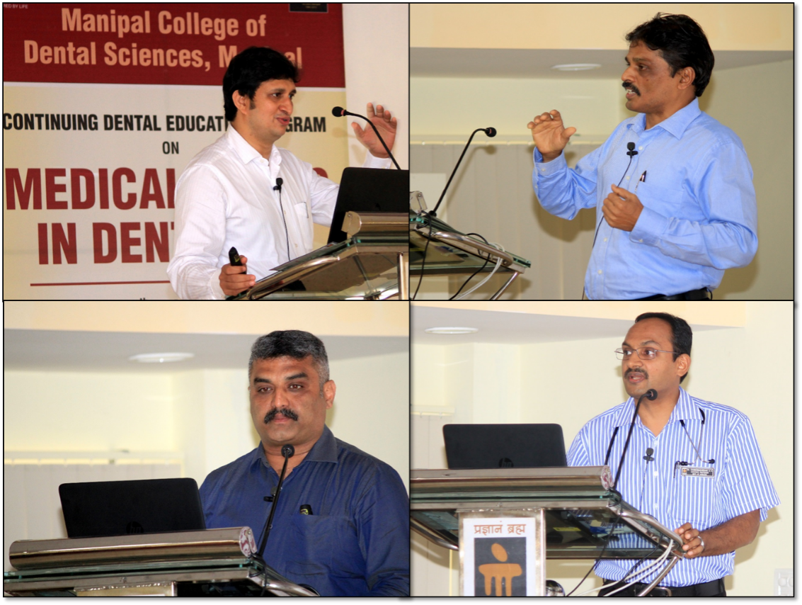 Department of Oral Medicine and Radiology, MCODS, Manipal organized a half day Continuing Dental Education program “Medical issues in Dentistry” on 29th July 2015 at Dr T M A Pai Hall . Dr Nirmala N Rao, Dean of MCODS, Manipal was the chief guest for the inaugural function. After a brief inaugural function, four lectures of 45 minutes duration each were delivered by eminent speakers. Dr Ranjan Shetty, Professor and Head, Dept of Cardiology, KMC, Manipal elaborated on “Cardiac disorders- What a dentist must know”. Dr Manjunath Prabhu, Professor, Dept of Anesthesiology, KMC, Manipal rendered an informative lecture on the topic “Management of Chronic orofacial Pain”. Dr Abhay Kamath, Professor and Head, Oral and Maxillofacial Surgery, MCODS, Manipal spoke about “Antibiotics for Orofacial infections”. Concluding session by Dr Chandrashekhar U K, Associate Professor, Dept of Medicine, KMC, Manipal addressed the “Considerations while prescribing drugs for dental ailments in medically compromised patients” A total of 180 delegates including faculty, postgraduate students, interns and dental practitioners attended the programme. Karnataka State Dental Council awarded 2 Credit points to this programme.