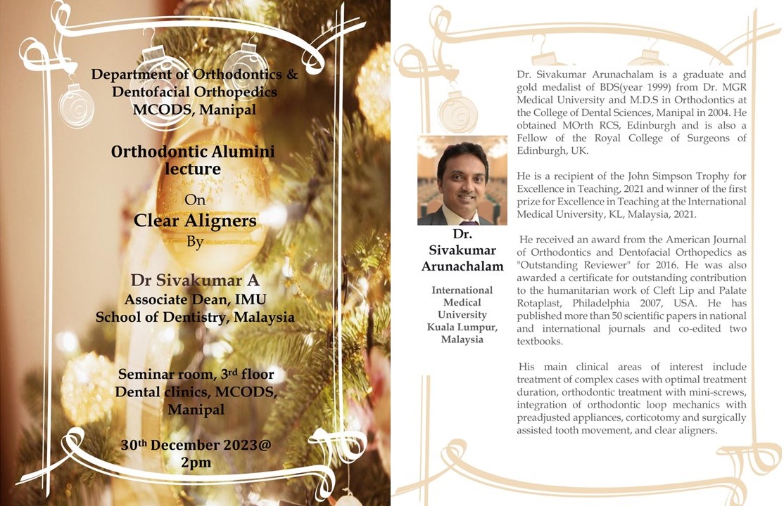 The Department of Orthodontics organized an Orthodontic PG alumni lecture on Clear Aligners on the 30th of December 2023. The resource person for the program was Dr.Sivakumar A, an alumni from the 2004 batch of postgraduates of the department. He is currently serving as the Associate Dean (Quality), and Associate Professor at the School of Dentistry, International Medical University, Kuala Lumpur, Malaysia.