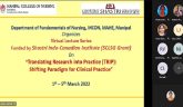 The Department of Fundamentals of Nursing, Manipal College of Nursing, Manipal Academy of Higher Education (MAHE), Manipal organized 5 days Virtual Lecture Series on “Translating Research into Practice (TRIP): Shifting Paradigm for Clinical Practice. This was funded by Shastri Indo-Canadian Institute (SCLS Grant)”. The inaugural program of this 5-day virtual lecture series was held on 1st March 2022 between 3.30 – 4.00 pm followed by the first-day session. Dr Prachi Kaul, Director, Shastri Indo-Canadian Institute, New Delhi, the Chief Guest for the programme addressed the participants during the inaugural program. The lecture series aimed to emphasize the efficient translation of research into clinical practice for the benefit of patient care by enhancing the knowledge on Translational Research its processes, models, challenges, and strategies.
