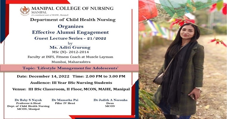 Department of Child Health Nursing, Manipal College of Nursing, Manipal Academy of Higher Education, Manipal organized an Alumni Guest Lecture on “Lifestyle Management for Adolescents” on December 14, 2022, between 02.00 PM & 03.00 PM for III Year BSc Nursing students through Microsoft Team Platform. Ms. Aditi Gurung, Faculty at the Institute of Nutrition and Fitness Science (INFS), Fitness Coach at Muscle Layman, Mumbai, Maharashtra, and alumna (MSc Graduate 2012-2014 batch) of MCON, Manipal was the speaker for the session. She discussed the various aspects of lifestyle management among adolescents with a focus on physical activity, exercise, sleep, and screen time. She quoted relevant examples and incorporated evidence-based research findings during her talk. Ms. Aditi also shared her life experiences which motivated her to transform to be a full-fledged fitness coach apart from being a nurse. Her vision to bring changes in the lifestyle of young adolescents and thereby improve their overall well-being is well appreciable. The session was informative and interesting as it dealt with the various changes and modifications needed in our day-to-day life.