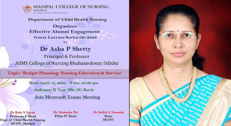 Department of Child Health Nursing, Manipal College of Nursing (MCON), Manipal Academy of Higher Education, Manipal organized an alumni guest lecture on “Budget planning: Nursing Education & Service” on April 18, 2022, between 03.00 pm & 04.00 pm for postgraduate nursing students through Microsoft Team Platform. Dr Asha P Shetty, Principal & Professor, All India Institute of Medical Sciences (AIIMS) College of Nursing, with the additional responsibility of Chief Nursing Officer at AIIMS, Bhubaneshwar, Odisha and alumna (MSc Graduate 1994-1996 batch) of MCON, Manipal was the speaker for the session. She discussed the various aspects of budgeting including the process of budget planning for nursing college and nursing service department, and also different types of budgets. She also emphasized the importance of nurses’ involvement in budget planning, which facilitates the empowerment of nurses in financial planning and management. Dr Asha P Shetty shared her experience of budget planning in her organization.