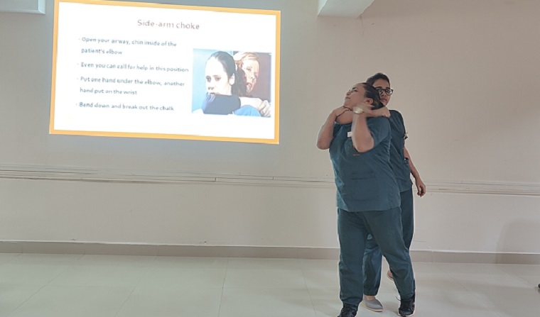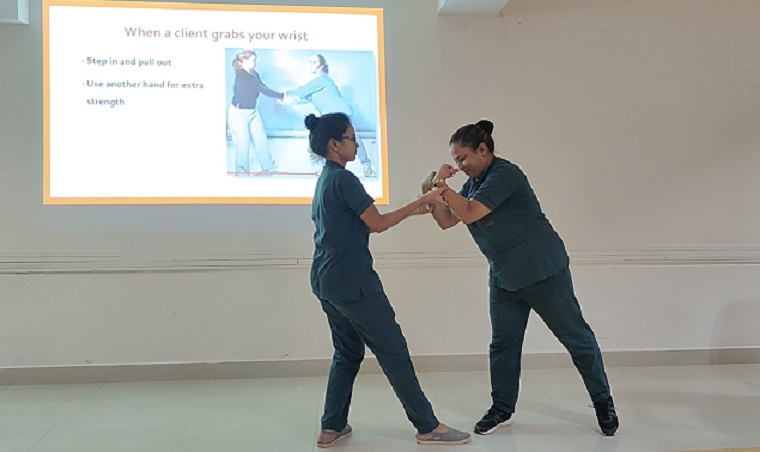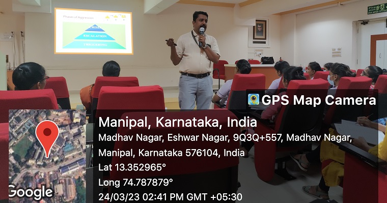 Ms. Riva Das II year MSc nursing student welcomed the faculty of the department of Psychiatric Nursing and the participants to the program. Dr. Binil V, Associate Professor, Department of Psychiatric Nursing, MCON, MAHE, Manipal was the resource person. He explained the importance of having knowledge of aggression management to protect self and the patients. He also emphasized that by using proper skills and techniques nurses can prevent violence and protect themselves from aggressive patients. During the session, many self-defense techniques were demonstrated by the MSc nursing students to the participants. A total of 35 staff nurses from Kasturba Hospital, Manipal attended the session. The vote of thanks was proposed by Ms. Sumalatha. P, II year MSc nursingr student.