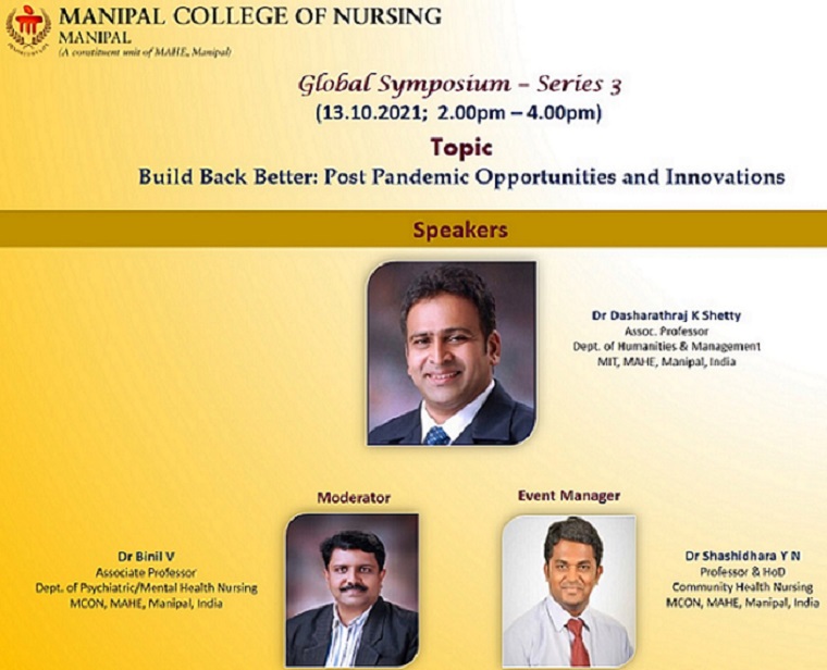 Global Symposium on Collaborative Healthcare Practices & Challenges in Current Times, series-3 was organized by the Team-Expanding Reach and Internationalization, Manipal College of Nursing, MAHE Manipal on October 13, 2021, from 2 pm to 4 pm. The invisible organism COVID -19 has caused a tremendous impact on the physical, mental, and social life of every individual. There is no exception for any organization or institution which has not been affected. We have to fight, combat, and resist this situation to revert to normal situations by adapting simple, feasible, and practicable innovative solutions.