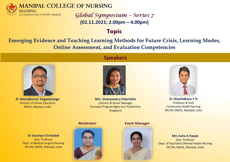 Global Symposium Series –7 on ‘Emerging Evidence and Teaching Learning Methods for Future Crisis, Learning Modes, Online Assessment, and Evaluation Competencies’was organized by Team- Expanding Reach and Internationalization of Manipal College of Nursing, MAHE, Manipal on November 02, 2021, from 2 pm to 4 pm.