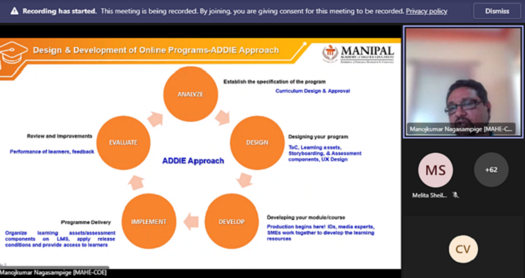 Dr Shashidhara Y N discussed regarding the competencies of online communication skills, competencies of online teaching and tips for successful communication. Dr Manojkumar Nagasampige elaborated on designing, developing and improving an online programme. Mrs Sivaneswary Palanibilo, explained about collaboration and industry requirements, implementation of Group work Skills Questionnaire (GSQ), its implementation in the module. She also explained on ‘Sharing on Lecturer’s perspective on e-assessment and e-proctoring’.