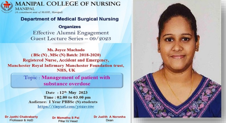 Department of Medical-Surgical Nursing, Manipal College of Nursing, Manipal organized an effective alumni engagement Guest Lecture on “Management of patient with substance overdose” on May 12, 2023, between 2.00 pm & 3.00 pm to I year PBBSc Nursing students through Microsoft Teams Platform. Ms. Joyce Machado (BSc (N) Batch: 2013- 2017), MSc (N) Batch: 2018- 2020), Registered Nurse, Department of Accident and Emergency, Manchester Royal Infirmary, Manchester Foundation.