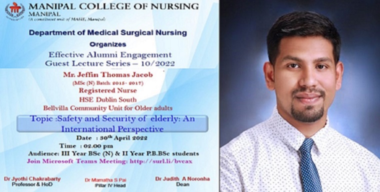 Department of Medical-Surgical Nursing, Manipal College of Nursing, MAHE, Manipal organized an effective alumni engagement Guest Lecture series on “Safety and security of elderly: An International Perspective” on 30th April 2022 between 02.00 pm & 03.00 pm to III year BSc Nursing and II year PBBSc Nursing students through Microsoft Teams Platform. Mr Jeffin Thomas Jacob (BSc 2010-2014 & MSc: 2015- 2017 batch), Registered Nurse, HSE Dublin South, Bellvilla Community Unit for Older adults, Ireland spoke on the topic. He spoke on fall identification and its prevention, skin care including pressure ulcer prevention, elder abuse and factors affecting nutrition in the elderly. He also gave information about the role of nurses in caring elderly in Ireland and the different tools used in their settings. A total of 57 participants including students and faculty members were present.