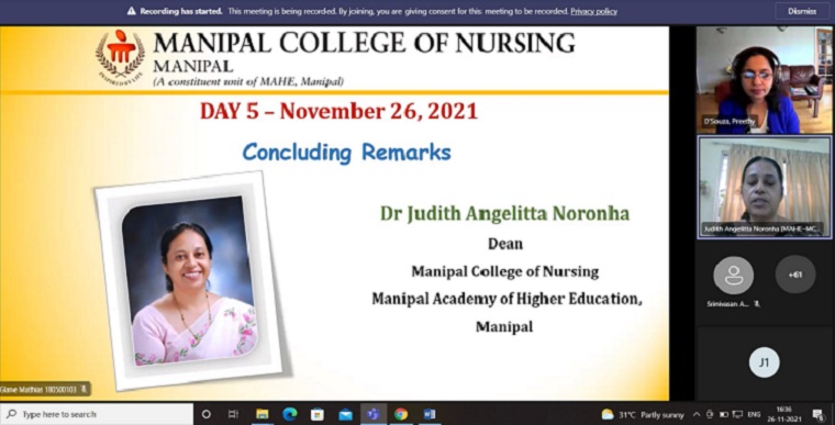 The concluding remarks of the five-day workshop was given by given by Dr Judith A. Noronha, Professor and Dean, MCON, MAHE, Manipal. Ms Meena Konsam, Research Scholar and student convenor, Manipal College of Nursing, MAHE, Manipal, proposed the vote of thanks. Participants actively participated in all the sessions. Last days sessions were technically coordinated by Ms Edlin Glane Mathias, Research Scholar, MCON, MAHE, Manipal and the faculty coordinator for the day was Dr Baby S Nayak, Professor & Head, Department of Child Health Nursing, MCON, MAHE, Manipal.