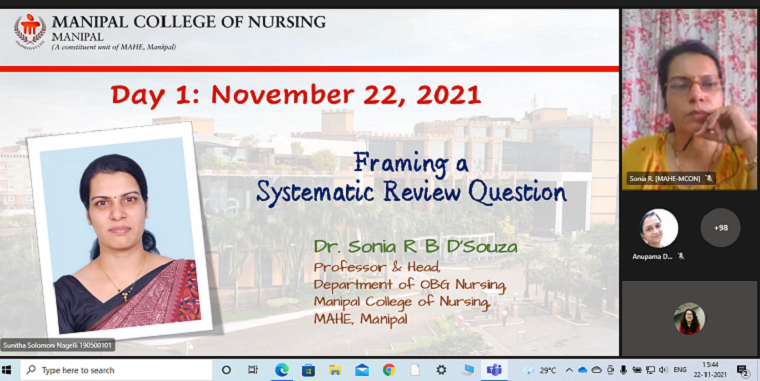 The last session for the day was on –‘Framing a systematic review question’- by Dr Sonia R.B D’Souza Professor & Head, Dept. of OBG Nursing, MCON, MAHE, Manipal. Dr Sonia stated that just like every journey starts from baby steps, a systematic review should be started by framing the research question. She explained in her talk about formulating answerable systematic review questions and discussed the question formation framework- PICO, the purposes of PICO, components of SR questions and also gave examples for SR questions. The session ended with the chat-based discussion activity along with the audience. The first day’s sessions ended with good comments from the audience. Around 102 delegates participated in the session. The session was moderated by Ms Sunitha Solomon Nagelli, Research Scholar, MCON, MAHE, Manipal; technically coordinated by Ms Monalisa Saikia,