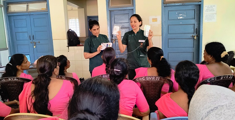 The program was started with a welcome speech by Mrs Clara, I year MSc student, MCON. The purpose of the session was initially explained to the participants. The session was conducted using the lecture method with demonstration techniques of CPR such as chest compressions, rescue breaths, and the use of an Automated External Defibrillator (AED), followed by a demonstration using a mannequin, an AMBU bag, and an Automated External Defibrillator (AED). Hands-on training was provided for those who were voluntarily willing to show the re-demonstration. A total of 22 ASHA workers, 3 ANM, and one CHO attended the program. Mrs Surekha, I year MSc student, MCON conveyed a vote of thanks.