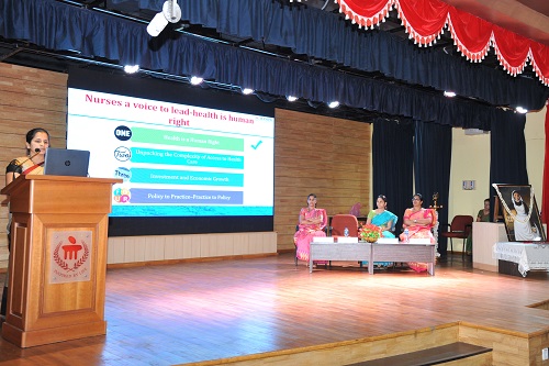 Dr. Leena Sequira emphasized on the topic ‘Health is a human right’ as focused by the International Council of Nurses (ICN). The key areas covered were: right to health, health responsibility, why nurses a voice to lead and how the right to health applies to nurses. She also highlighted on the challenges set before us in maintaining health, general principles of health system and determinants of health including the core elements of health function.