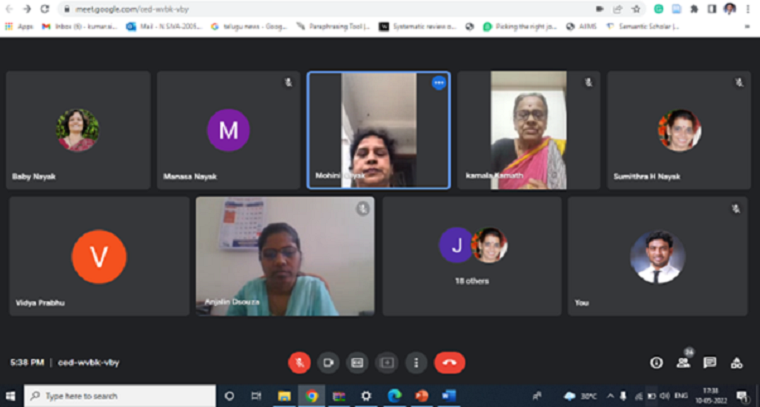 The department of Child Health Nursing, in association with RSB Mahila Vedike Manipal organized the sessions on ‘Nursing as profession and its scope’ on 10th May 2022 between 5.30pm to 6.30pm through google meet with the view create an awareness about the nursing profession among younger generation & community. Mrs. Anusuya V Prabhu, Assistant Professor, MCON Manipal highlighted different level of available nursing courses, career opportunities and importance of nurses in health care field. The admission process and scholarship facilities for nursing students were discussed by Mrs. Janet Alva, Assistant Professor, MCON Manipal. A total of 29 women with their families and nine faculty members participated in this program. The program was co-ordinated by Dr.Anjalin Dsouza, Assistant Professor, MCON Manipal.