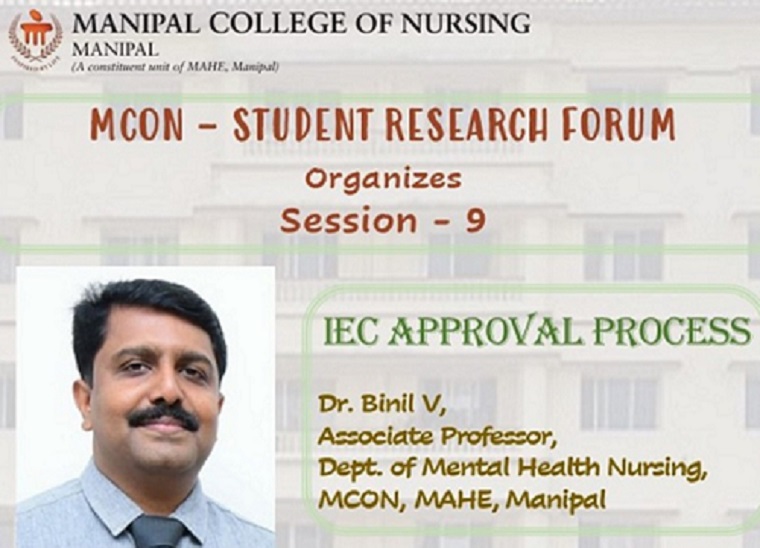 Manipal College of Nursing - Student Research Forum, MAHE, Manipal, organized the ninth session of the year-long lecture series on the ‘IEC Approval Process’ on November 28, 2022, from 4 pm to 5 pm. The Resource Person for the session was Dr. Binil V, Associate Professor, Department of Mental Health Nursing, Manipal College of Nursing, MAHE, Manipal.