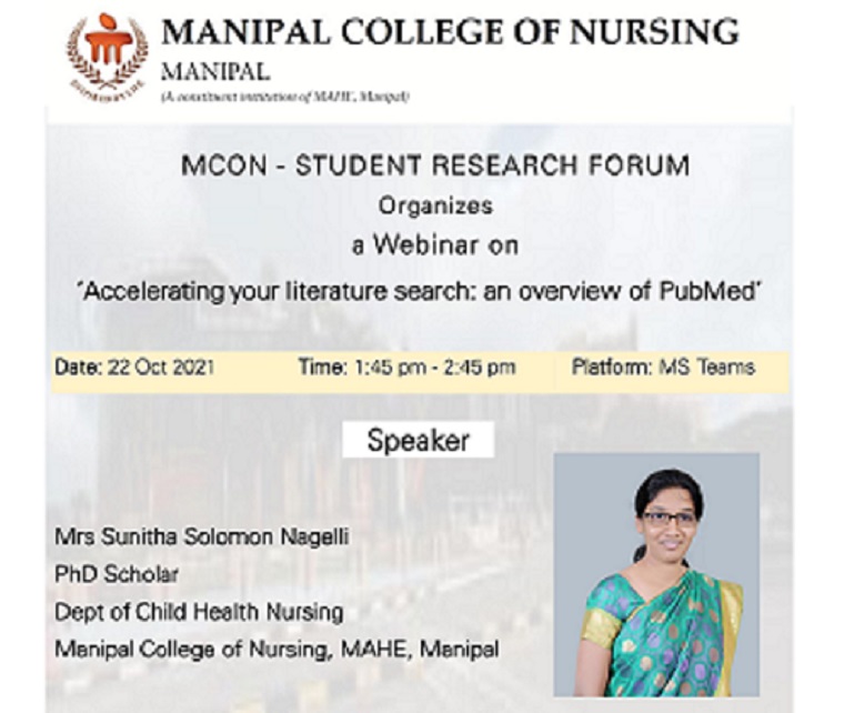 Manipal College of Nursing - Student Research Forum, MAHE, Manipal, organized the fifth session of the year-long webinar series ‘Inculcating Research Culture in Students’ on the topic - Accelerating your literature search: an overview of PubMed on 22nd October 2021, from 1:45 pm to 2:45 pm. The resource person for the session was Mrs Sunitha Calvin, PhD Scholar, Dept. of Child Health Nursing, MCON, MAHE, Manipal.