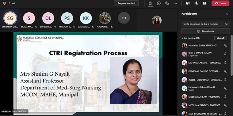 Manipal College of Nursing - Student Research Forum, MAHE, Manipal, organized the fourth session of the year-long webinar series ‘Inculcating Research Culture in Students’ on the topic - CTRI Registration Process on 24 September 2021, from 6:00 pm to 7:00 pm. The resource person for the session was Mrs Shalini G Nayak, Assistant Professor, Department of Medical-Surgical Nursing, MCON, MAHE, Manipal.