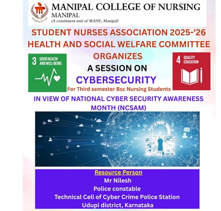 In view of National Cyber Security Awareness month (NSSAM), the Health and Social Welfare Committee of the Students Nurses Association (SNA) 2025, Manipal College of Nursing, Manipal Academy of Higher Education, Manipal conducted an awareness programme for third semester BSc Nursing students of MCON, on 30th October 2025 from 3.30 pm to 4.00 pm in Lecture Hall 2, 3rd floor, Basic Science building, Manipal. Mr Nilesh, a Police constable from the Technical Cell of the Cyber Crime Police Station in Udupi district, Karnataka,was the resource person. The session focused on the wise use of social media, protecting the digital identity, avoiding suspicious links, unknown downloads, phishing emails, cyberbullying, keeping the software updated, using trusted networks and respecting others online. There were 156 students who actively participated. The programme concluded with a vote of thanks delivered by Ms Rosemi Ann Reji. The overall programme was coordinated by Ms Rosemi Ann Reji, 7th semester BSc nursing and Mr Sankar P, 5th semester student, under the guidance of Mrs Janet Alva, Assistant Professor, and Dr Shalini G Nayak, Assistant Professor, Senior Scale, Department of Medical Surgical Nursing, MCON, MAHE, Manipal. This initiative is in alignment with Sustainable Development Goal 3: Good Health and Well-being, SDG 4: Quality Education.
