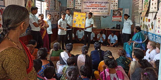 The programme began with the invocation by Ms Jenitha Shanthi D Almeida and team, followed by a welcome address by Ms Renvitha D Almeida. Ms Zareena Banu, the ASHA worker, gave a brief talk on the importance of observing National Deworming day. A role play was enacted by Mr Sharath and the team, second-year PBBSc Nursing students on the significance of National Deworming Day. A health talk regarding the causes of signs and symptoms, management and preventive aspects of the worm infestation was delivered by Ms Smitha and team. An action dance on hand hygiene was performed by Ms Seema and team to inculcate hand hygiene in their daily life to prevent infection. Mrs Reshma, Lecturer, Department of community health nursing, addressed the common problems for children during the worm infestation and about its prevention.
