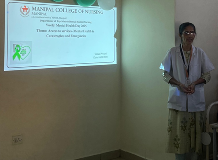 The Department of Psychiatric (Mental Health) Nursing, Manipal College of Nursing, MAHE, Manipal, conducted events on account of World Mental Health Day 2025 for two consecutive days on 10th and 15th Oct 2025, under the theme “Access to Services—Mental Health in Catastrophes and Emergencies". It emphasises the urgent need for mental health support in crisis situations like natural disasters, conflicts, and public health emergencies. This programme is aligned with Sustainable Development Goal 3 (Good Health and Well-being) and Goal 4(Quality Education).
