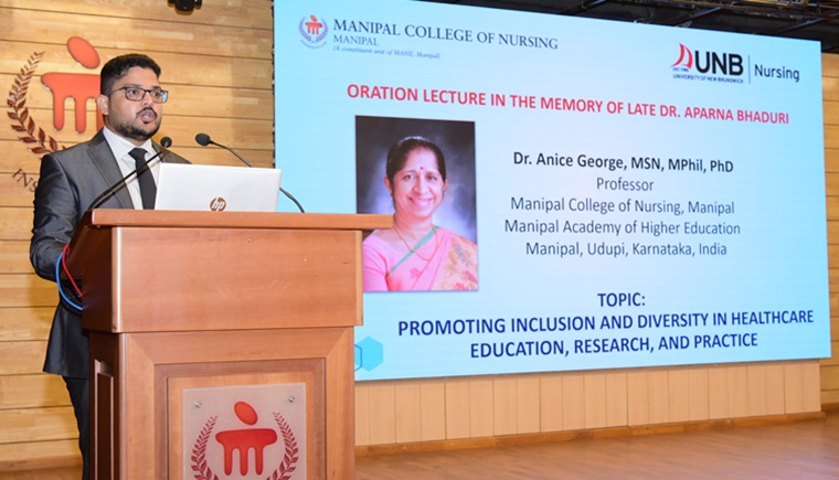 Manipal College of Nursing, Manipal Academy of Higher Education, Manipal, organized an Alumni Oration lecture on 08th July 2025, in memory of a legend in nursing, Dr (Late) Aparna Bhaduri, a highly esteemed nurse researcher of international repute, and former PG Coordinator at Manipal College of Nursing, MAHE, Manipal. The oration lecture was held as part of the two day Manipal International Conference on “Equity, Diversity & Inclusion (EDI) in Health: Envisioning a Future of Global Collaboration for Education, Research & Practice,’ organized by MCON, MAHE, Manipal, in association with the Faculty of Nursing, University of New Brunswick (UNB), Canada.