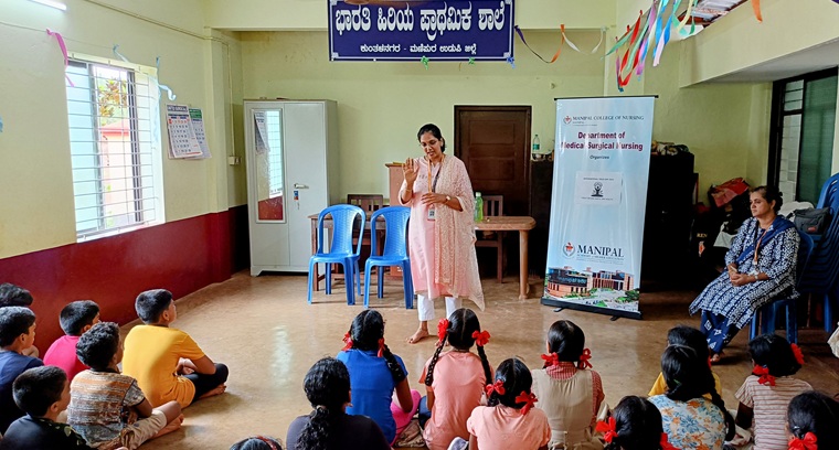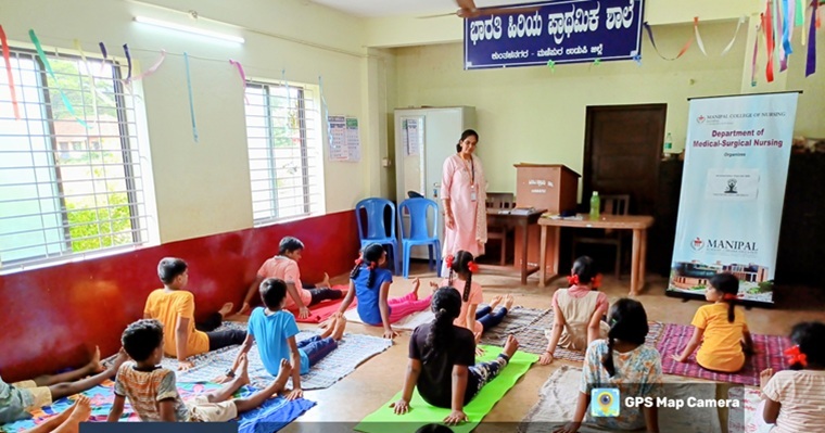 As a part of International Yoga Day 2025, the department of Medical-Surgical Nursing, MCON, MAHE, Manipal, organized an engaging yoga awareness session on 20th June 2025 at Bharathi Higher Primary School, Kunthalanagara, Manipura, Udupi District. The session was held between 3:00 PM & 4:00 PM. Mrs. Poovitha Shruthi Paramashiva, Assistant Professor, Division of Yoga, Centre for Integrative Medicine and Research (CIMR), MAHE, Manipal was the resource person. Mrs. Poovitha addressed the participants on the significance of International Yoga Day and briefed them about the health benefits of yoga. The students of 6th and 7th standard were part of the programme and were guided through the various yoga postures and a brief meditation session. The interactive and inspiring session drew participation from 40 attendees, including school teachers. The programme highlighted the role of yoga in promoting physical and mental well-being, contributing to the Sustainable Development Goals (SDGs)-Good Health and Well-being (Goal 3), and Quality Education (Goal 4). The days activity concluded with the distribution of snacks to all the children, leaving them energized and motivated. Overall, the program was coordinated by Mr. Raghavendra Nayak, Lecturer and Mrs. Janet Prameela D’Souza, Assistant Professor-senior scale, under the guidance of Dr. Jyothi Chakrabarty, Professor and Head, department of Medical-Surgical Nursing, MCON.