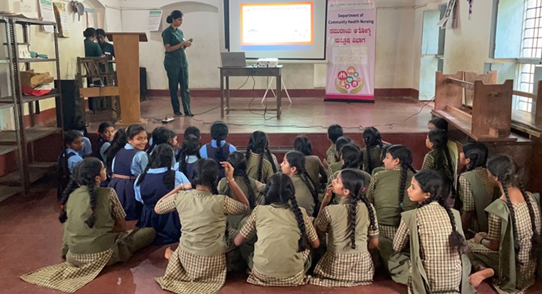 For female students of 5, 6, and 7th classes, Ms. Anvika T Maidan, MSc nursing student, conducted a session on the reproductive system, physical growth, menstrual health, and hygiene. The event concluded with a vote of thanks proposed by Mr. Prasad, the school teacher.