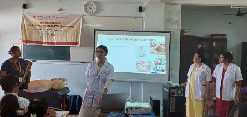 The First and Second Year MSc Nursing students and faculty members from the Department of Child Health Nursing, Manipal College of Nursing (MCON), Manipal Academy of Higher Education (MAHE), Manipal, in collaboration with Rotary Club, Parkala conducted a school health program in Parkala High School, Parkala, Udupi District, Karnataka on 3rd June 2023, between 11.30 a.m. and 1:00 p.m. The school health program was organized under the guidance of Dr. Binu Margaret, Assistant Professor- Selection Grade, Dr. Sangeetha, Assistant Professor- Selection Grade, and Dr. Baby S Nayak, HoD, Department of Child Health Nursing, MCON, Manipal. The aim of the program was to create awareness on “First Aid and Resuscitation” for the students of classes 8, 9, and 10 and faculty members of Parkala High School, Parkala, and Rotary Club members of Parkala Rotary Club. The outreach program contributed towards sustainable development goal 4 (SDG 4) to achieve quality education.