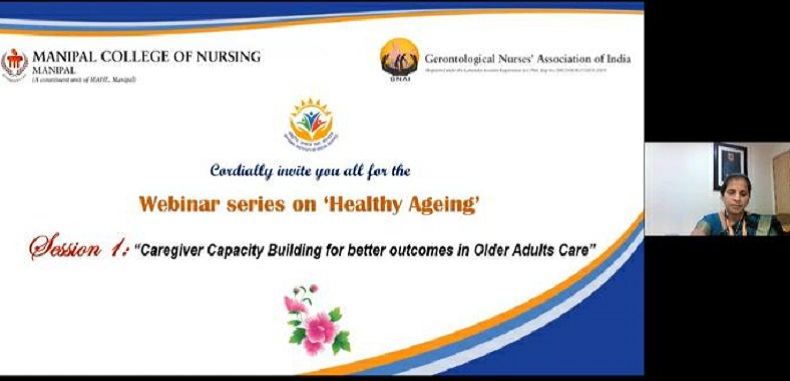 Manipal College of Nursing, MAHE, Manipal in association with Gerontological Nurses Association of India (GNAI) organized a webinar series on the theme ‘Healthy Ageing’ through the Microsoft team online platform. This webinar series was funded by the National Institute of Social Defence (NISD), New Delhi. The five days’ webinar series was conducted between 04 February 2021 & 25 February 2021. Experts from different fields took sessions on various topics, namely, session on ‘Caregiver capacity building for better outcomes in older adults’ care’ by Dr. Letha M.Joseph, Consulting Associate Duson Duke Johnson & Johnson Nurse leadership fellow, USA ; session on ‘Role of Hospice and Palliative care in Gerontology’ by Dr. Seema Rao, Consultant at Department of Palliative Medicine and Supportive Care at Kasturba Medical College and Hospital, MAHE, Manipal; session on ‘Post COVID Geriatric care’ by Dr. Ananya Das, Consultant Geriatric Medicine, Manipal Hospital, Bangalore; session on Elderly abuse and neglect by Dr. Sailesh Mishra, Founder President at Silver Innings Group, Founder A1 Snehanjali, Assisted Living Elder Care Home, Mumbai ; and session on ‘Effective engagement for older adults’ health ageing’ by Dr. Rejith Ramachandran, Family Physician & Consultant in Palliative Care & Director of Home Health Care Services – G. Kuppuswamy Naidu Memorial Hospital, Coimbatore, Tamil Nadu. A total of 550 participants attended the sessions conducted on various days.
