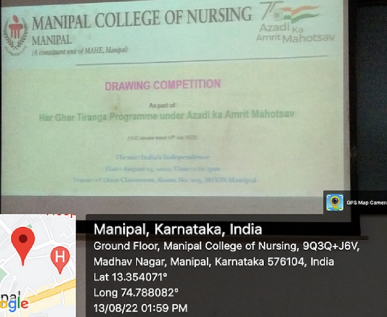 Manipal College of Nursing, MAHE, Manipal has organized a drawing competition on the theme “India’s Independence” on August 13, 2022, between 2.00 pm and 3.00 pm. Two students participated in the competition. This competition was related to the circular from University Grant Commission (UGC) on Har Ghar Tiranga dated 19th July 2022 and was coordinated by Ms. Shalini G Nayak, Assistant Professor; Manipal College of Nursing MAHE Manipal.