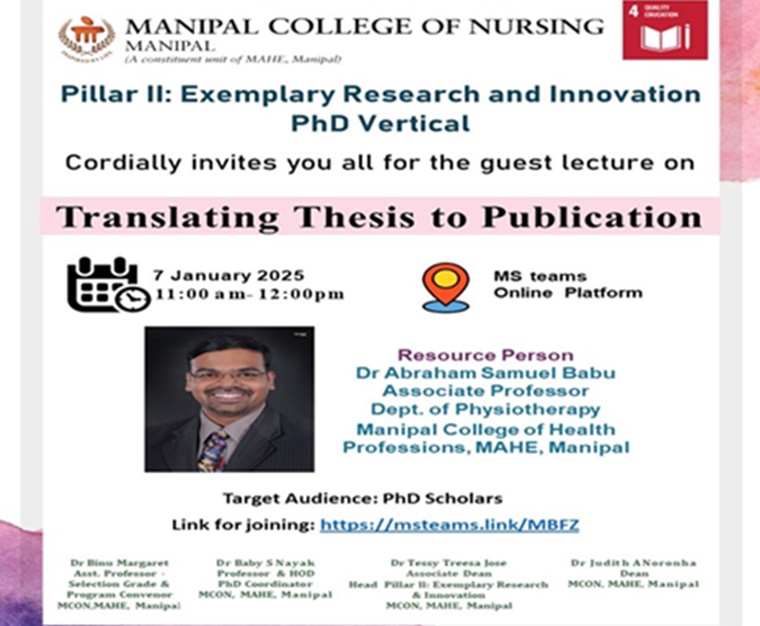 The PhD Vertical of Pillar II: Exemplary Research and Innovation, Manipal College of Nursing, Manipal Academy of Higher Education (MAHE), Manipal organized the guest lecture on 'Translating Thesis to Publication” on 7 January 2025, between 11 am and 12.00 pm for the PhD Scholars. Dr. Abraham Samuel Babu, Associate Professor, Department of Physiotherapy, Manipal College of Health Professions, Manipal Academy of Higher Education (MAHE), Manipal, India deliberated the session. Dr Babu highlighted the various ways of translating the thesis into high-impact academic publications. He emphasized considering the readership and indexing of the journal, choosing the right journal, and its impact, while selecting the journal for writing the academic publication. He also highlighted the different article categories, including original articles, systematic and narrative reviews, and brief reports/research letters, which can be considered while publishing the research based on the research need, publishing trend, and strengths and weaknesses of the study. The session also gave insight into the different dissemination strategies, the importance of presenting the research at conferences for better networking, and opportunities for collaboration. He also emphasized that PhD scholars have a clear time plan and strategy from the inception of the study for disseminating their research through conferences and publications, and to stay committed to the plan throughout the research process.