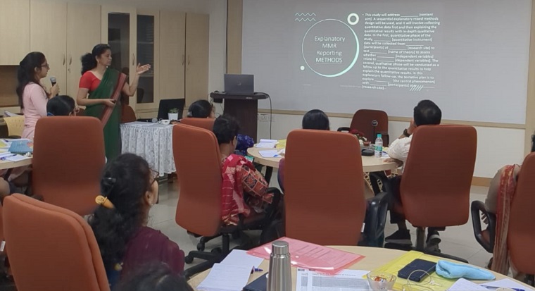 The First session of the day, the introduction to mixed methods research, was delivered by Dr. Linu Sara George, Professor, and Head, Department of Fundamentals of Nursing, MCON, Manipal. She elaborated on mixed methods research, methodological characteristics, advantages, and challenges. Dr. Shradha S. Parsekar, an independent research consultant, delivered the second session on mixed methods research study design. She focused on the rationale of using mixed methods, data collection strategies, and various MMR designs. The post-lunch session on developing a protocol for mixed methods research was delivered by Dr. Anupama D S, Research Fellow Department of Global Health Governance, Prasanna School of Public Health MAHE, Manipal. She emphasized the steps of protocol development, including the conceptual framework. The last session of the day was a hands-on session on developing goals and protocol for a mixed methods study facilitated by Mr. Anil Raj, Assistant Professor, Department of Medical-Surgical Nursing, MCON Manipal, and Ms. Mitchelle S Lewis, Lecturer, Department of Fundamentals of Nursing,