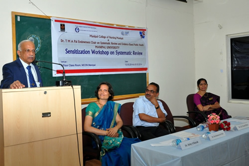 Manipal College of Nursing, Manipal and Dr.T.M.A.Pai Endowment chair on Systematic review and Evidence Based Public Health, Manipal Academy of Higher Education organized a one-day sensitization workshop on Systematic Review on March 12 and 20, 2014 respectively. Faculty from Manipal College of Nursing Manipal, Manipal School of Nursing and Manipal College of Nursing Mangalore attended the workshop. The objective of the workshop was to create awareness about systematic review. The workshop was attended by 76 participants in 2 batches.