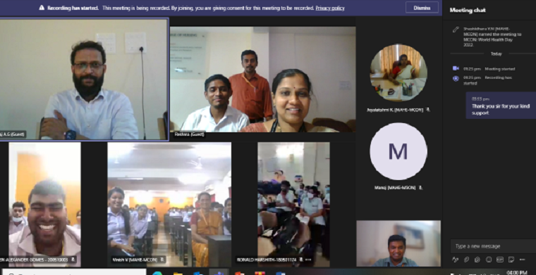 The seminar on the topic ‘Health Care Waste Management and ‘Environment and Health’ was organized on April 07, 2022, at 2 pm through the online (Microsoft Team platform) and blended mode to the students, faculty of MCON, MSON and other colleges of MAHE. The resource persons were Mrs Prescilla, Infection Control Nurse, Kasturba Hospital, Manipal and Mr Gururaj A G, District Consultant for Quality Assurance, NHM, Udupi. Mrs Prescilla highlighted the importance of student nurses’ role in the control of cross-infection during their clinical posting. Mr Gururaj, in his address, explained the hazards and effects of biomedical waste. A total of 150 participants from different fields of health science attended the session online and in offline mode. Mrs Jeyalaxmi, Mrs Manjula and Mr Vinish V, Assistant Professors, MCON, MAHE coordinated the event.