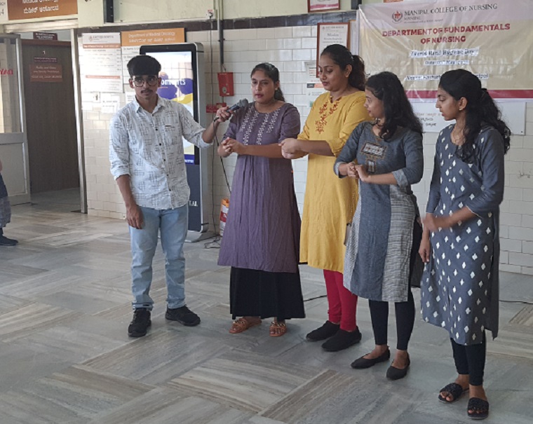 A roleplay spreading awareness on the importance of hand hygiene along with a dance on hand hygiene steps was done by the students of the second semester to create awareness among the patient and patient attendees in the three Outpatient department areas (Main OPD Block, Shirdi Saibaba Cancer Center, Women, and Child Block) of the Kasturba Hospital Manipal. At the end of the program, a pocket card with hand washing steps from WHO was distributed among them. There was a good response from the viewers, and some actively came forward to demonstrate the same.