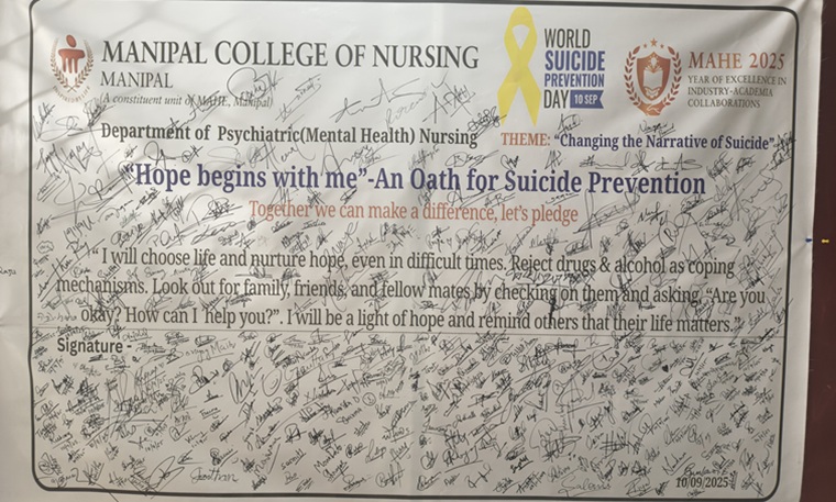 The Department of Psychiatric (Mental Health) Nursing, Manipal College of Nursing (MCON), MAHE, commemorated World Suicide Prevention Day on September 10, 2025, with the theme “Changing the Narrative on Suicide.” The day-long observance included interactive sessions, awareness campaigns, oath-taking pledges, and public outreach, drawing enthusiastic participation from students, faculty, and the wider community. The programme is aligned with the United Nations Sustainable Development Goals (SDGs) 3, 4, 10, 16, and 17.