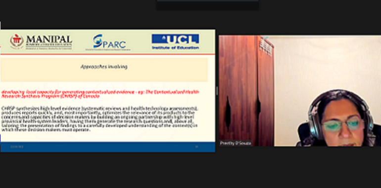 The virtual workshop series on "Evidence synthesis by Systematic Reviews” commenced with a session on Day 1 on ‘Introduction to Systematic Reviews &  Steps of systematic review’ by Ms. Tenzin Phagdol, Research Assistant – ICMR funded project, MCON, MAHE. The resource person highlighted the importance of evidence-based practice, types, and importance of systematic reviews and also presented an overview of the steps of the systematic review. The second session of Day 1 focused on “Development of a systematic review protocol and PROSPERO registration” by Mr. Anil Raj, Assistant Professor, Department of Medical-Surgical Nursing, MCON, MAHE. A detailed discussion on how a systematic review protocol can be developed was demonstrated and the steps of registration of a systematic review on PROSPERO were deliberated. The first session on Day 2  focused on “Framing a systematic review question/PICOTS”, which was deliberated by Dr. Sonia R.B D’Souza, Professor and HoD, Department of OBG Nursing, MCON, MAHE, who discussed in detail the PICOTS framework for systematic review. The second session of Day 2 of the virtual workshop was on ‘Formulating a search strategy & Databases’ search including practical sessions’ by Dr. Baby S Nayak, Professor and HoD, Dept. of Child Health Nursing, MCON, MAHE. She discussed in detail how the search strategy needs to be formulated and also demonstrated the steps of searching databases like PubMed Medline and CINAHL among others.  The first session of Day 3 was on “Data collection and de-duplication of studies using Rayyan software” which was deliberated by Ms. Prima JJ D’Souza, Assistant Professor, Department of Fundamentals of Nursing, MCON, MAHE. The session included detailed demo sessions on how data collection and de-duplication of studies can be done using the Rayyan software. The day ended with a session on “Selection of studies and Data extraction” by Ms. Anupama DS, Research Fellow, Department of Global health governance, Prasanna School of Public Health (PSPH), MAHE, Manipal. The first session of the fourth day of the virtual workshop series was deliberated by Dr. Edlin Glane Mathias, Research Fellow- Public Health Evidence South Asia, Dept. of Health Information, PSPH, MAHE, Manipal, who spoke on “Quality appraisal of Non-RCTs and Observational studies”, and the next session of the day was dealt by Dr. Judith A Noronha, Professor and Dean, MCON, MAHE on the topic “Quality appraisal of RCTs and Assessing risk of bias (ROB)”, emphasizing the importance of assessing ROB in systematic reviews. The last day of the virtual workshop series dealt with “Quality appraisal of systematic review using AMSTAR 2” deliberated by Dr. Binil V, Associate Professor, Department of Mental Health Nursing, MCON, MAHE, and the final session of the day was taken by Ms. Meena Konsam, Research Scholar, MCON, MAHE on “PRISMA and reporting of Systematic Review”, where the updated version of PRISMA was discussed in detail. A total of 78 participants participated in the workshop series and we received very good feedback for all the sessions of the workshop. Participants in their feedback also appreciated the virtual workshop and expressed their wish to have more similar workshops conducted by Manipal College of Nursing Manipal in the future.