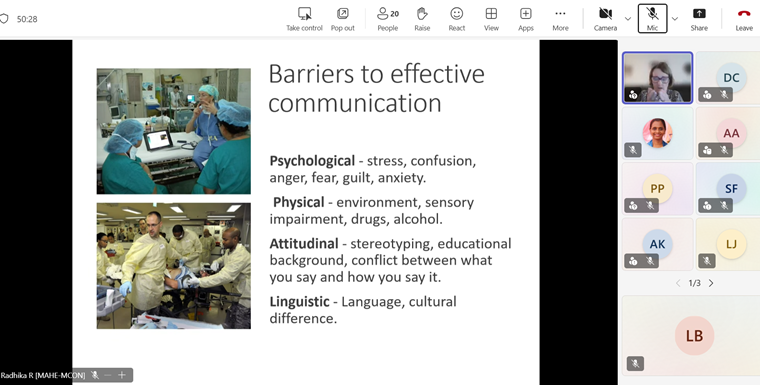 The resource person for the session was Dr. Toni Bewley, Honorary Lecturer at the University of Liverpool and Adjunct Faculty at MCON, MAHE, Manipal. Dr. Bewley shared her expertise in managing differences of opinion and handling diverse tasks in high-pressure environments such as the OR. She emphasized the significance of understanding group dynamics and employing effective communication techniques to prevent and resolve conflicts among healthcare professionals.