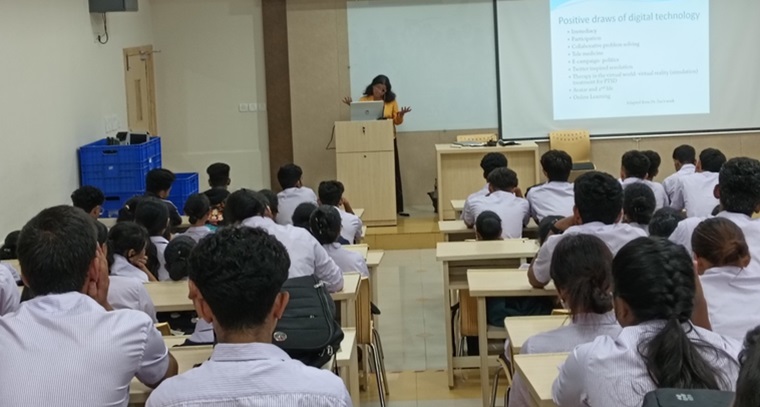 A session on “digital well-being’” was taken to the 1st semester BSc. Nursing students between 11.30 am and 12.30 pm. She has emphasized the positive draws of digital technology, screen time limits, and digital self-care tips. The “Emotional intelligence and self-awareness” session was delivered to PhD scholars at 2.30 pm. She emphasized the difference between emotions and feelings, the importance of introspecting oneself using Johari’s window, and the importance of EQ over IQ. A session on “building resilience in clinical practice” was conducted for the students of the 5th semester BSc. Nursing. She highlighted the nurse burnout among mental health nurses and the importance of managing stress. She further discussed various ways of balancing life and building resilience among nurses. These sessions helped in achieving the Sustainable Development Goals of Quality Education (SDG 4), and Partnerships for the Goals (SDG 17). The visit was coordinated by the Department of Psychiatric (Mental Health) Nursing.