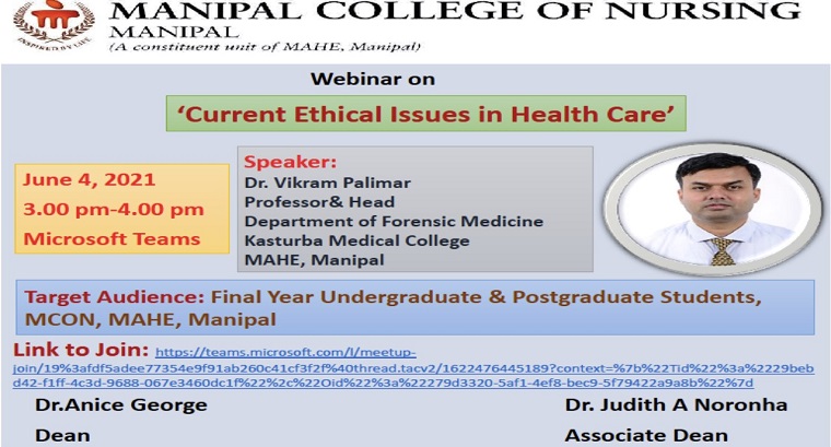 Manipal College of Nursing (MCON), MAHE, Manipal had organized a webinar on the topic “Current Ethical Issues in Health care” on 04 June 2021 between 3.00 pm & 4.00 pm for final year BSc(N), PBBSc(N) and MSc (N) students of the college. Dr Vikram Palimar, Professor and Head, Department of Forensic Medicine, KMC Manipal was the resource person. He discussed ethical issues by narrating few case scenarios and emphasized on ethical principles to be followed in the clinical practice. He also explained on access to health care for all and ethical responsibilities during the pandemic. The students clarified their doubts and responded that the program was interactive. The session was conducted as a webinar in Microsoft Teams. A total of 78 students and four faculty members attended the session.
