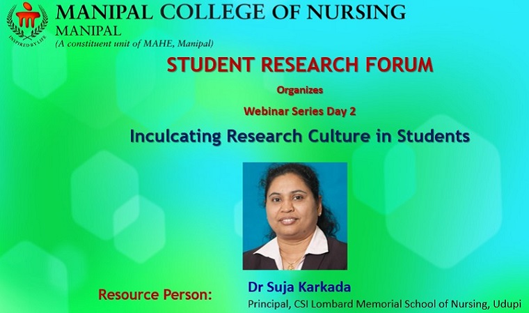 Manipal College of Nursing (MCON) – Student Research Forum (SRF) organized series of webinars on the theme “Inculcating research culture in students” from 12 December 2020 to 15 January 2021. The planning of the webinar series was done after an initial need assessment. After the need assessment, Ms Edlin, PhD Scholar, Department of Child Health Nursing, MCON, MCON-SRF president, Ms Clarita, PhD Scholar, Department of Medical-Surgical Nursing Secretary – MCON-SRF, and the MCON-SRF team under the guidance of Dr Sonia R.B D’Souza, Professor and HoD, Department of Obstetrics and Gynaecological Nursing, MCON, the MCON-SRF faculty advisor, planned the program.