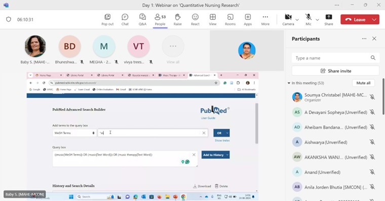 The two-day webinar on ‘quantitative nursing research’ was held between June 24 and 25, 2024, through the Microsoft Teams Online Platform. This was organised by the first-year students of Nurse Practitioner in Critical Care (NPCC) Postgraduate Residency Program, Medical Surgical Nursing Department, in collaboration with Pillar 2 (IoE): Exemplary Research and Innovation of Manipal College of Nursing (MCON), MAHE, Manipal.