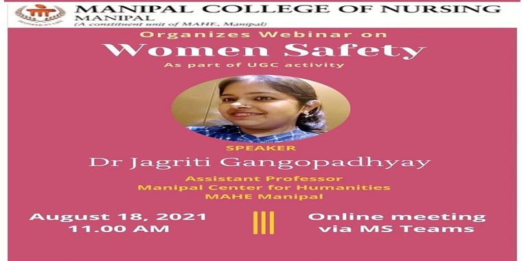 Manipal College of Nursing, MAHE, Manipal has organized a webinar on the topic “Women Safety” on August 18, 2021, between 11 am and 12 noon. Dr Jagriti Gangopadhyay, Assistant Professor and the faculty coordinator for the Center for Women’s Studies, at the Manipal Centre for Humanities, MAHE Manipal shared her expertise on Women safety. She highlighted the facts, causes endangering women safety in different contexts such as homes, workplaces and in society. The effect of the COVID-19 pandemic on women safety in the current situation was emphasized during the webinar. Need for ensuring women safety in families, the workplace and several other contexts in terms of strengthening the policies and policy reforms were other highlights of the session. She also mentioned the organisations which are funding the welfare and safety of women.