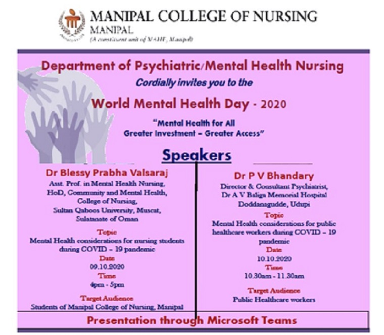 Another webinar was conducted on “Mental health considerations for public health care workers during COVID-19 pandemic”, on 10th October, 2020 between 10.30 am & 11.30 am. Dr. P.V. Bhandary, Director & Consultant Psychiatrist Dr. A.V. Baliga Group of Institutions Udupi was the resource person of the webinar. He spoke on mental health concerns, myths about COVID-19, and also about strategies to overcome COVID-19. There were 120 participants who attended the webinar. Mrs. Savitha, Assistant Professor, MCON, co-ordinator of the program welcomed the audience and introduced the theme of WMHD-2020. Mrs. Asha K. Nayak, Assistant Professor, MCON, delivered the vote of thanks.