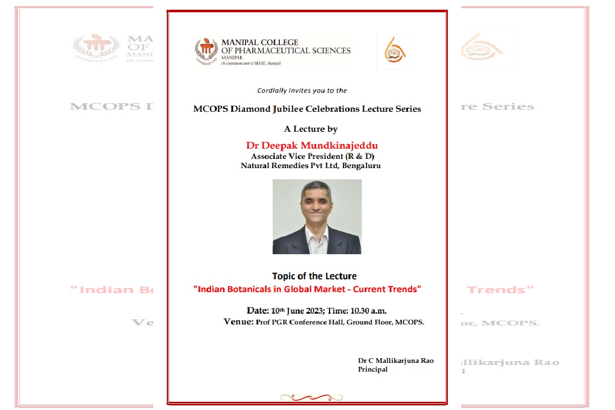 MCOPS DJC Lecture on "Indian Botanicals in Global Market - Current Trends"  by Dr Deepak Mundkinajeddu, Associate Vice President (R & D) Natural Remedies Pvt Ltd, Bengaluru